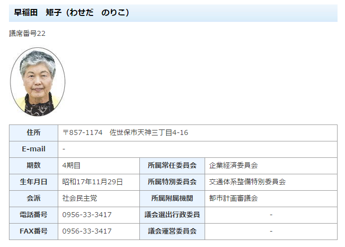 ただ、今回のような報じられ方に関してはどうかと思うんですよ。今回の運動、市民団体「佐世保女性ネットワーク」が主催したとのことですが、その代表の早稲田矩子さんという方を調べてみたら、社民党長崎県佐世保総支部の代表を勤める現役の佐世保市議じゃないですか。